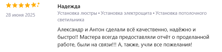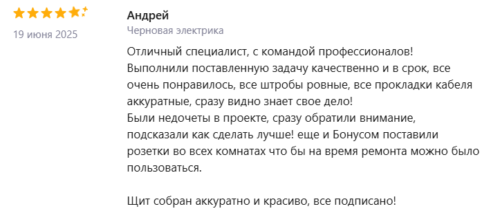 Благодаря многолетнему опыту, более 10 лет, нами были разработаны и внедрены решения, позволяющие комфортно и главное безопасно пользоваться всем электрооборудованием в домах наших клиентов. Гарантия на работы, выполненные нашей компанией, составляет не менее 5 лет.